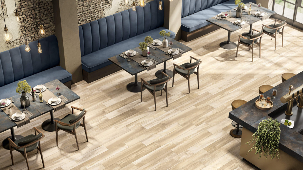 Para pavimentos de restaurantes, hotel y centros bienestar, así como para todo el sector hospitality, Caesar propone unas soluciones de gres porcelánico 100% italiano.